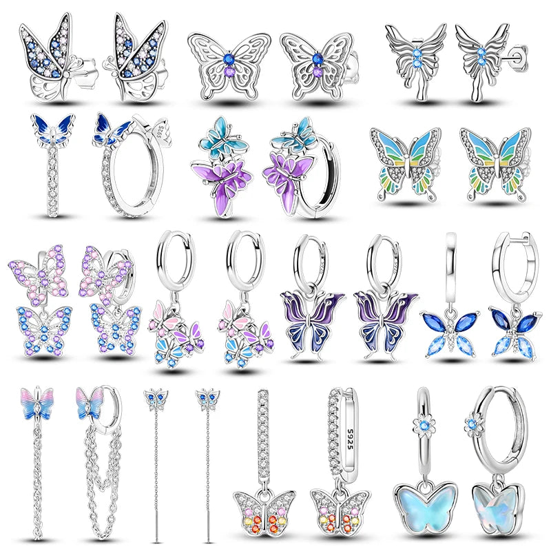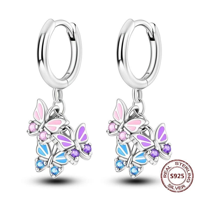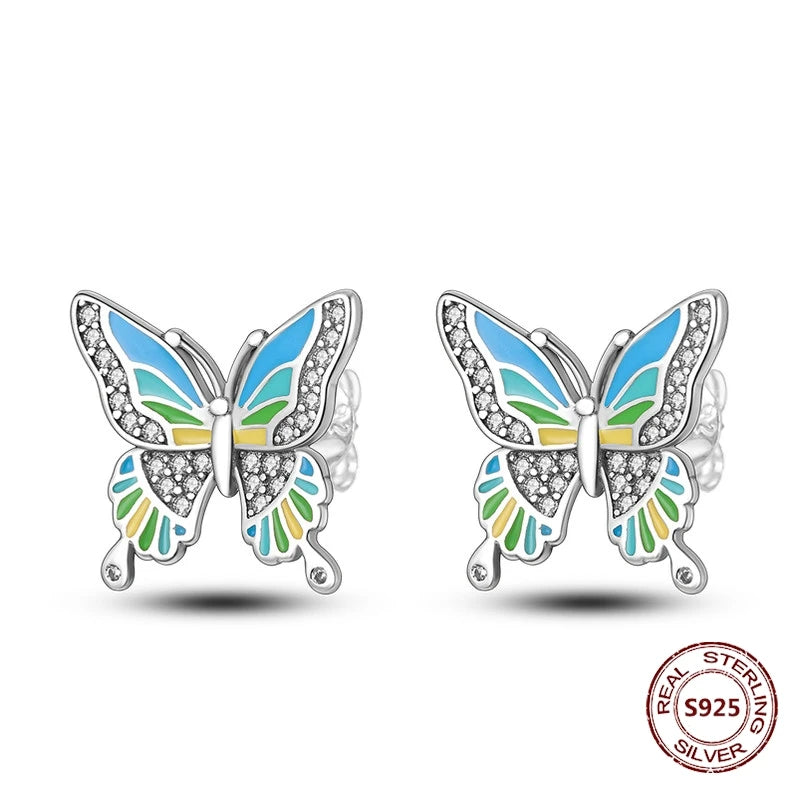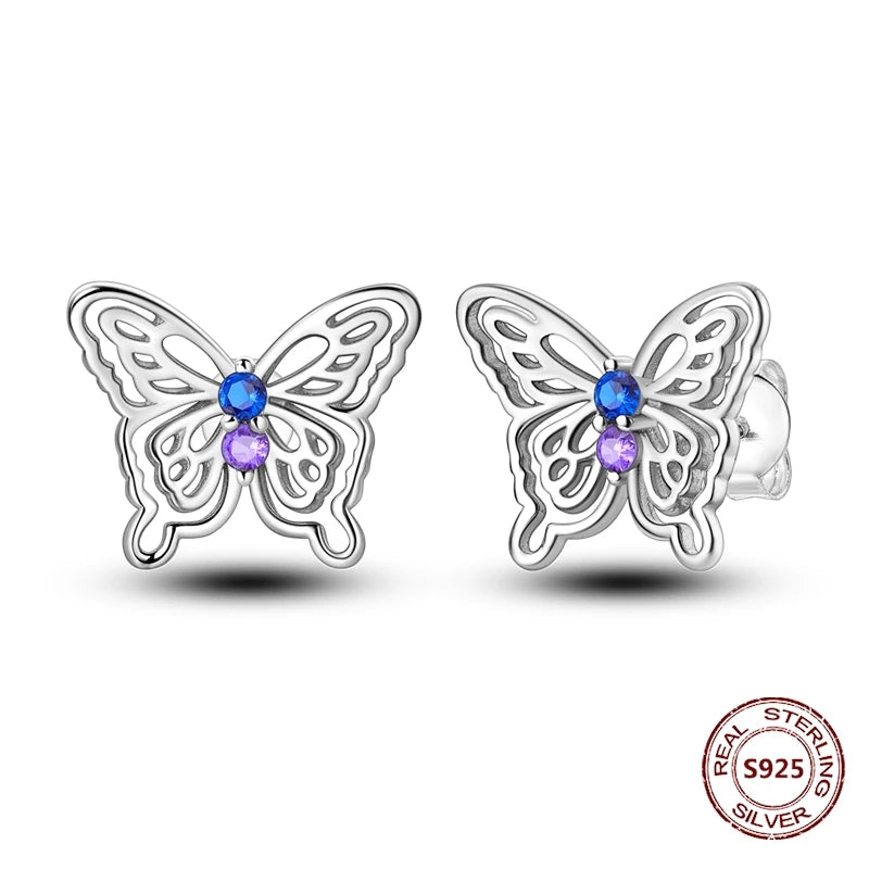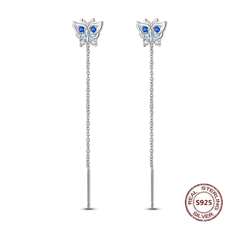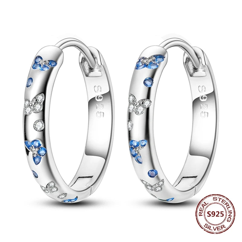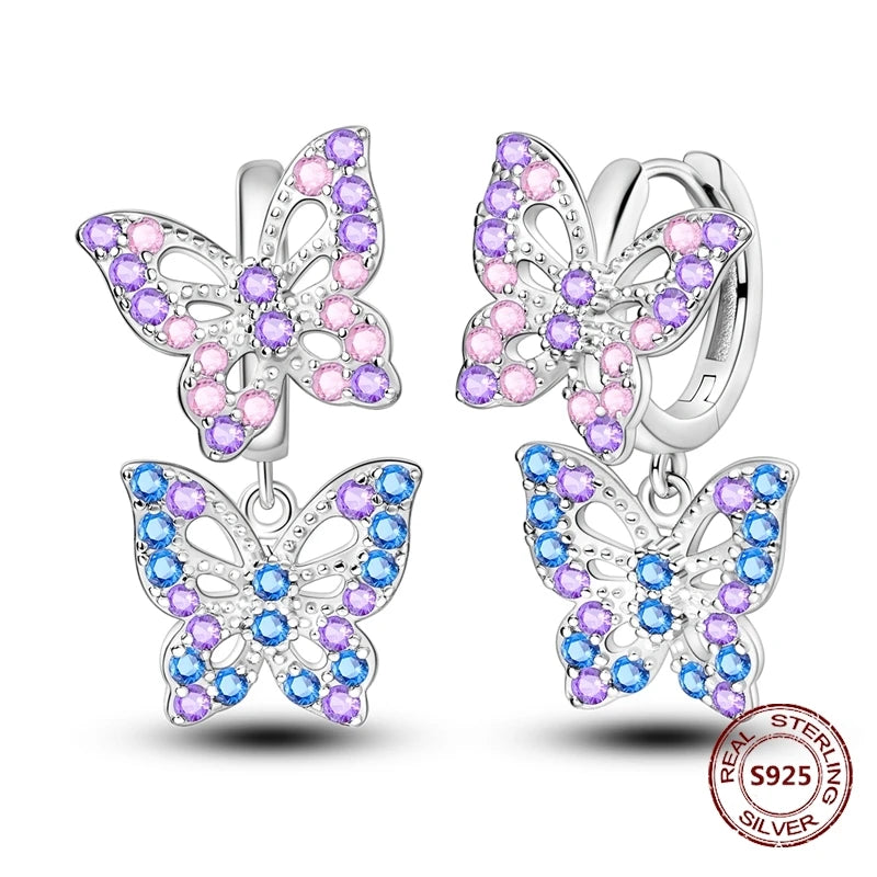 Laat je oren spreken met deze elegante zilveren oorbellen, versierd met een verfijnde blauwe vlinder en een sprankelende hanger. De zirkonia stenen vangen het licht op een manier die een subtiel aurora-effect creëert, waardoor je een magische glans draagt bij elke stap die je zet.